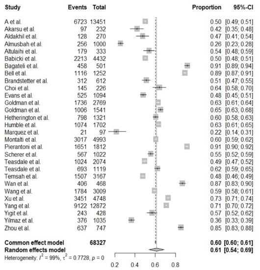 All analyses were performed using R 4.1.2 software. After a logit transformation of the data, a random intercept logistic regression model was used for the meta-analyses. The within-study variation was estimated with the 95% confidence interval (CI) and the between-study variation was estimated with the maximum likelihood estimator for tau2. The Higgin’s and Thompsons’ I2 was used to assess heterogeneity. Subgroups analyses, meta-regression, and sensitivity analyses were conducted to explore the sources of heterogeneity. Publication bias was detected by Egger’s test. p < 0.05 was considered statistically significant.