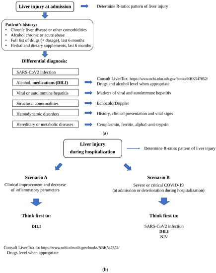 (a) Suggestion of a flow chart to assess DILI in patients with COVID-19 at admission. (b) Suggestion of a flow chart to assess DILI in patients with COVID-19 during hospitalization.