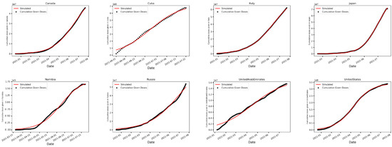 Dots represent cumulative given doses, and curves are fitted based on the logistic growth model. Countries are sorted alphabetically. Here, only some select countries are shown. The average of R2 across all countries is 0.99.