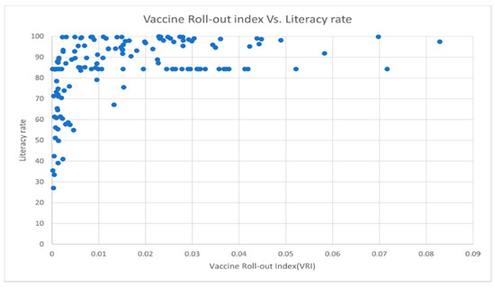 Vaccine Roll-out Index (VRI) versus Literacy rate (Adult literacy rate is the percentage of people aged 15 years and above who can both read and write with a clear understanding of a short simple statement about their everyday life).