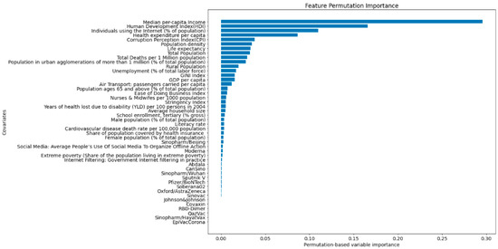 Covariates listed according to their Permutation Feature Importance. Four top features are: (i) median per capita income; (ii) human development index; (iii) the percentage of individuals who have used the internet in the last three months (latest data available) via a computer, mobile phone, personal digital assistant, games machine, digital TV, etc.; and (iv) health expenditure per capita. Additionally, the results illustrate that other covariates, particularly the type of vaccine or the Gini index, do not play a key role.