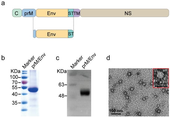 Construction and characterization of Japanese encephalitis virus (JEV) virus-like particle (VLP). (a) Schematic design of JEV VLP vaccine candidate. (b) purified recombinant prM/Env protein was analyzed by SDS-PAGE. (c) Immunoblot analysis of recombinant prM/Env protein with polyclonal antibodies against JEV. (d) VLP shape and size were tested by electron microscopy with negative staining method. spherical VLP size was 20–30 nm in diameter and mainly in ~30 nm. Scale bar: 100 nm, 50 nm.