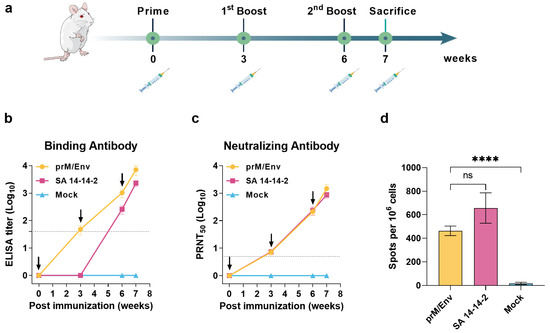JEV VLP induced robust humoral and T cell immune responses in BALB/c mice. (a) Flow chart of JEV VLP immunogenicity evaluation in mice model. Solid vertical lines indicate weeks of immunization (black), sacrifice (green), and syringe symbols indicate blood sampling time points. (b) JEV specific binding antibodies were assessed by ELISA. Dotted lines indicate detection limit. (c) Neutralizing antibodies against JEV SA 14-14-2 strain were measured by PRNT assay. Dotted lines indicate detection limit. (d) Spleens and splenocytes were collected at weeks 7 for IFN-γ detection by ELISPOT after stimulation with JEV Env peptide pools. Data are shown as means ± SEM (standard errors of means). p values were analyzed by Student’s t-test (ns, p > 0.05; ****, p < 0.0001).