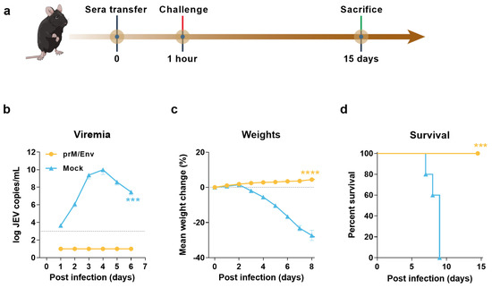Passive protection of anti-VLP sera in immunocompromised mice model. (a) Flow chart of experimental design. Each A129 mouse was given 200 μL sera from JEV VLP or PBS vaccinated mice via IV route. After 1 h of injection, each mouse was infected via i.p. with 1 × 105 TCID50 of SA 14-14-2 strain. Solid vertical lines indicate timeline of immunization (black), challenge (red), and sacrifice (green). Serum collected within 6 DPI were used for viral loads detection by qRT-PCR (b). Dotted lines indicate detection limit. Bodyweight changes (c) and survival rates (d) of mice in all groups were monitored daily after challenge. Data are shown as means ± SEM. A two-way analysis of variance (ANOVA) with Tukey’s multiple-comparison tests was performed to statistically analyze significant difference of viral loads between JEV VLP and PBS-Mock. Weight change was analyzed by Tukey-Kramer multiple comparison test. Survival data were analyzed by two-sided log-rank test. (***, p < 0.001; ****, p < 0.0001).