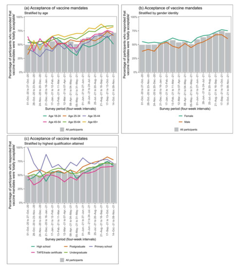 Longitudinal trends in acceptance of vaccine mandates in demographic groups. Acceptance of vaccine mandates was considered present in participants who responded that vaccine mandates for high-risk groups were ‘totally acceptable’ (see Table 1 for survey question specification). Grey bars display acceptance of vaccine mandates in the aggregated survey population. Lines display acceptance of vaccine mandates disaggregated by (a) age, (b) gender identity, and (c) highest education qualification attained. This figure displays longitudinal trends for the demographics elected by Generalised Estimating Equation (GEE) model selection only. See Supplementary Figure S2 for longitudinal trends in other demographic groups.