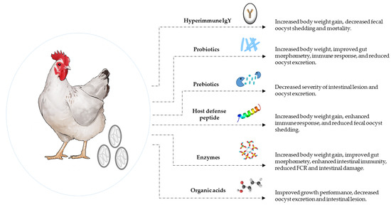 Antibiotic alternatives to control coccidiosis in chickens. Various novel strategies including hyperimmune IgY [166,167,168], probiotics [170,171,173,174,175], prebiotics [181,182,183], host defense peptides [187,188,189], enzymes [180,181,182,183,184,185,186,187,188,189,190,191,192,193,194,195,196,197,198,199,200], and organic acids [192] have been developed for coccidiosis control in chickens.