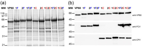 3.1. Design, Generation, and Characterization of Chimeric RHDV VLPs Displaying FCV and CPV Target Epitopes