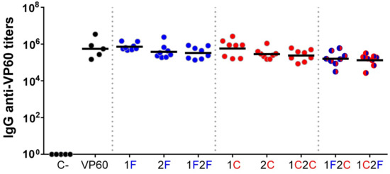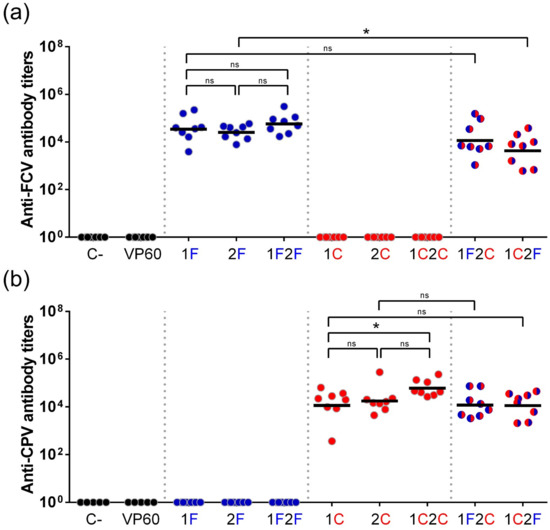3.3. Humoral Immune Responses Elicited by Chimeric VLPs Displaying FCV and CPV B-Cell Epitopes in Mice