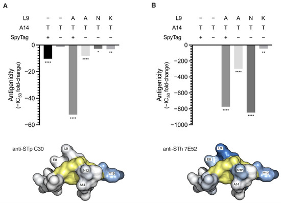 Antigenicity of STh mutant peptides. The antigenicity of the STh mutant peptides towards the anti-STp C30 (A) and anti-STh 7E52 (B) mAbs were tested using competitive ELISAs. Mutations carried by the STh mutant peptides and the presence of an N-terminal SpyTag are indicated above the plots. The ELISA plates were coated with native STh peptide, and free native STh (control) or the indicated mutant peptides were used to compete for binding to the coating. The 50% inhibitory concentration (IC50) for all peptides were estimated using four-parameter logistic regression analyses, and the bar graphs show the IC50 fold-changes of all mutant peptides relative to that of native STh. The fold-changes are plotted as negative values to indicate reduced antigenicity. To test whether the IC50 for a given mutant peptide was significantly different from that of native STh, ordinary one-way ANOVA and Dunnett’s multiple comparisons test was performed. Significantly different IC50s are indicated below the bars: ****, p < 0.0001, **, p < 0.01, *, p < 0.1. Space-filling structural models are shown below the bar graphs to illustrate the location of the named main epitope residues for each mAb (shades of blue) [22,27]. The six cysteines forming the three-disulfide bridges are shown in yellow.