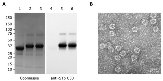 The SpyT-tagged peptides were conjugated to mi3-SpyC by mixing carrier and peptide at 1:3 molar ratios, allowing the spontaneous formation of isopeptide bonds, as documented by SDS-PAGE and immunoblot analysis (Figure 2A). The conjugation reaction was very efficient and resulted in near complete shifts in mobility from 34 kDa of the mi3-SpyC monomer to 38.3 kDa of the mi3-SpyC:SpyT-STh-A14T and mi3-SpyC:SpyT-STh-L9A/A14T conjugate monomers. Since mi3 is a 60-mer nanoparticle, a fully assembled particle displays 60 STh mutant peptide. To verify that mi3 conjugates assembled into nanoparticles, we removed excess peptides and unassembled mi3 monomers by extensive dialysis using a 300 kDa MWCO membrane and subjected the nanoparticles to TEM analysis (Figure 2B). As evident from the micrograph, mi3-SpyC:SpyT-STh-L9A/A14T form uniform particles with a diameter of approximately 25 nm, which is consistent with previous results [20].
