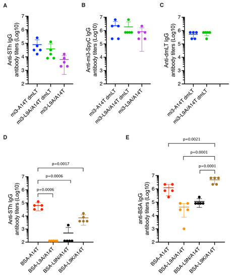 The mi3-SpyC:SpyT-STh-A14T and mi3-SpyC:SpyT-STh-L9A/A14T nanoparticles were used to immunize five mice each, using dmLT as adjuvant [31]. In addition, five mice were immunized with mi3-SpyC:SpyT-STh-L9A/A14T without any adjuvant. Anti-STh, anti-mi3-SpyC, and anti-dmLT IgG titers were estimated using ELISAs with STh peptide, mi3-SpyC, or dmLT coating, respectively (Figure 3A–C). The mi3-A14T-dmLT sera had the highest mean titers, followed by the mi3-L9A/A14T-dmLT sera. Not unexpected, the unadjuvanted mi3-L9A/A14T sera had the lowest mean titers. The differences in mean anti-STh titers were consistent with the observed differences in anti-mi3-SpyC titers, and the anti-dmLT IgG titers were similar both within and between the adjuvanted groups.