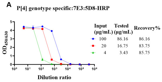 During the fermentation or purification process, the proteins could be contaminated by other bacteria or proteins. Thus, it was important to determine whether the target protein was contaminated by VP4* proteins of other genotypes. To simulate contamination, the purified target genotype VP4 proteins were mixed with other genotype VP4* proteins (100 μg/mL: 10 μg/mL). The single-genotype VP4* proteins and protein mixtures were detected by each antibody pair after 10-fold serial dilution. As shown in Figure 4A, when detected by the P[4]-VP4*-specific antibody pairs, there was no significant difference in the detection signals of the P[4]-VP4* protein after the addition of P[6]-VP4* or P[8]-VP4*. The additionally added P[6]-VP4* and P[8]-VP4* proteins could be detected in the P[6]-VP4* and P[8]-VP4*-specific detection system (Figure 4B,C). Thus, if the target protein was contaminated by other genotypes, it could be identified by the genotype-specific sandwich ELISA.