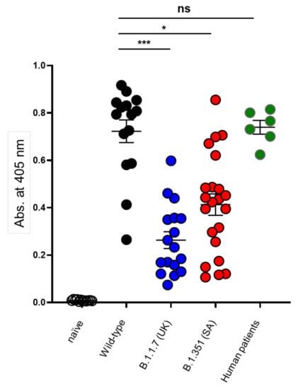 Humoral response against the spike glycoprotein among surviving mice and human patients. Endpoint values at 405 nm (−650 nm) representing the binding of naïve mouse sera (n = 12; open circles) and the sera obtained from mice surviving the infection with WT (n = 15; black circles), B.1.1.7 (n = 17; blue circles) and B.1.351 (n = 22; red circles) SARS-CoV-2 isolates towards the spike glycoprotein []. Human patients’ sera recovering from COVID-19 was also included (n = 6; green circles). Statistical differences were determined by a non-parametric Kruskal–Wallis with Dunn’s post hoc test. * p < 0.05, *** p < 0.005, ns = nonsignificant. The average background value based on 10 independent measurements was 0.0087 (range 0.004–0.014).