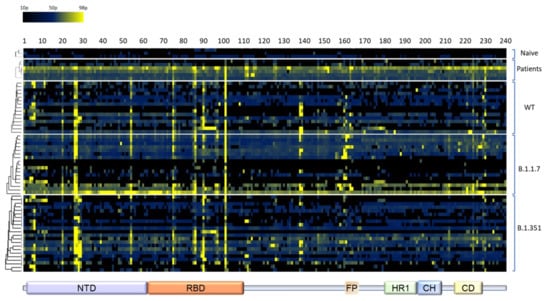 The absorbance values at 405 nm were plotted as a heatmap. The heatmap columns correspond to the 240 15-mer evaluated peptides, in consecutive order along the spike protein sequence. The heatmap rows represent the naïve, patients, WT, B.1.1.7 and B.1.351 samples. Hierarchical clustering was applied for each group, using the average linkage method [].