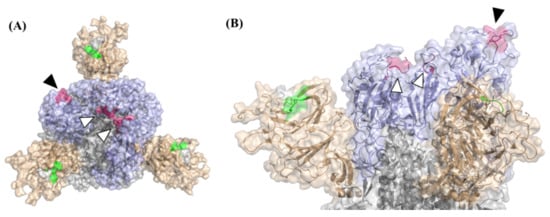 Spatial localization of the two most abundant cross-variant peptides on the spike trimer. Top (A) and side (B) Semi-transparent surface view of SARS-CoV-2 spike trimer (PBD 7C2l stripped off the 4A8 antibody). The N-terminal domain (NTD) is brown-colored and the receptor binding domain (RBD) is shown in purple. Other parts of the spike are colored in gray. The spatial localization of epitope 134QFCNDF139 is shown in green and epitope 501NGVGYQP507 is highlighted in dark pink. Black arrows mark the surface exposed epitope (when the RBD assumes the “up” position) and black-framed white arrows mark this epitope within the “closed” inaccessible position of the RBD. All analyses were performed by using the PyMol Molecular Graphics System (Version 1.7 Schrödinger, LLC (Portland, OR, USA)).