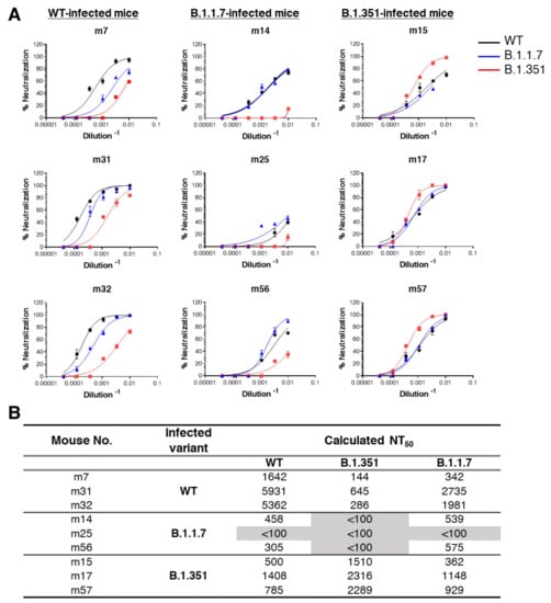 The overall similar linear epitope landscape generated by mice surviving the infection with WT SARS-CoV-2 isolate as well as the B.1.1.7 and the B.1.351 variants suggested that the polyclonal immune response generated in the mice may compensate for the differences in the structures of the spike glycoprotein that is evident between the three virus isolates []. To address this issue, a cross-neutralization efficacy assay by the plaque reduction neutralization test (PRNT) was performed. Nine serum samples collected from mice infected with either WT SARS-CoV-2 or the two VOCs: B.1.1.7 and B.1.351 strains were examined. VeroE6 cells were infected individually with each of the three SARS-CoV-2 strains and the neutralizing potency of each serum sample was calculated as the dilution that reduced plaque formation to 50% (NT50) for each variant. Figure 4, shows the titer-dependent neutralization profile (panel A) as well as the calculated NT50 values (panel B) of the nine representative serum samples that generated the highest anti-spike titers. As anticipated, all sera samples were most effective in neutralizing the virus variant to which the respective animals were exposed, compared to the other strains. Sera derived from WT-infected mice exhibited 2- to 5-fold and 9- to 19-fold decrease in NT50 values when tested against B.1.1.7 or B.1.351, respectively. In line with this result, while a minimal reduction (less than 2-fold) in the neutralizing potency of sera obtained from B.1.1.7-infected mice towards the WT strain was observed, the neutralization potency of these was 5-fold lower when tested against the B.1.351 variant. Finally, the neutralization potency of sera collected from B.1.351-infected mice, showed 2- to 4-fold reduction in neutralization against both WT and the B.1.1.7 variant (Figure 4B).