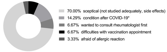 The main patient concern regarding the COVID-19 vaccination was that the vaccines might not have been studied properly, so some patients feared unwanted side effects. This finding is in line with an investigation in cancer patients [18]. Accordingly, in a cohort of patients with autoimmune and inflammatory diseases, the main reason to refuse vaccination was the fear of long-term adverse events [17]. At first glance, this is somewhat puzzling, since the available vaccines have been studied extensively [6,7,8,9], demonstrating not only high efficacy but also safety. Some of the patient concerns might have arisen from the rare occurrence (approx. 8.1 per million after the first shot, 2.3 per million after the second shot) of thrombosis with thrombocytopenia syndrome (TTS) after vaccination with the vector-based vaccine Vaxzevria (AstraZeneca) [25,26]. For the mRNA vaccines, self-limiting myocarditis and pericarditis have been reported (approx. 10 and 18 per million, respectively) [27]. Another reason might be the ongoing debate about the new technology, particularly with regard to the mRNA-based vaccines (alleged “gene therapy”). The significant association between preceding influenza or pneumococcal vaccination and protection against COVID-19 might imply vaccine scepticism in general. Ongoing patient education is clearly needed to improve vaccination rates in patients at risk.