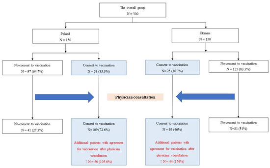 Massive loss of human life and health due to the COVID-19 pandemic has created challenges for healthcare systems, destroying supply chains as well as the economy, triggering a mental health crisis [1,2,3]. In a systematic review of 97 studies by Gómez-Ochoa et al. [4], it was estimated that the incidence of SARS-CoV-2 infection from healthcare workers samples was 11% using reverse transcription polymerase chain reaction (95% confidence interval (CI): 7, 15), and 7% (95% CI: 4, 11) using the presence of antibodies [4]. The COVID-19 pandemic has a negative impact on the mental and physical health of healthcare workers [5,6], and particularly unfavorable circumstances leads to severe disease and death [4,7]. The concept of severe disease includes a course that requires hospitalisation, intensive therapy, respiratory support, highly specialised respiratory equipment, or a fatal course of the disease. In some previously published reports, it was verified that in the case of pregnant women, infection with severe acute respiratory syndrome-Coronavirus-2 (SARS-CoV-2) is more frequently connected with severe disease, rendering it necessary to perform ventilation in an invasive manner: extracorporeal membrane oxygenation. In some cases, this may even cause death [8,9,10,11,12]. In a different research trial, an association was demonstrated between COVID-19 infection in pregnancy and the risk of preterm deliveries and caesarean sections [13]. There are also reports indicating vertical transmission with regard to the virus [14]. This can lead to fetal oedema or even death [15]. Among those more prone to asymptomatic infections, we may include children, who further transmit the virus to pregnant women [16,17]. Infection with COVID-19 in pregnancy is a risk factor for preterm birth and other detrimental pregnancy-related outcomes in comparison to women who are pregnant but are not infected with COVID-19 [1]. Vaccines can decrease the pace of an epidemic if vaccination is broadly accepted. A study in southern Italy of 1041 respondents over the age of 65 showed a high percentage (92.7%) of people who were vaccinated and were willing to vaccinate [18]. There are many existing arguments indicating the safety of vaccines for COVID-19. Studies on mRNA vaccines allow us to state that the immunogenicity, safety level, as well as tolerability of these precautionary measures taken among pregnant women do not differ from those applied in non-pregnant women at an analogous age [19]. COVID-19 vaccines comprise mRNAs encapsulated in a lipid nanoparticle, which are further transmitted to cells. The host cells are responsible for the production of coronavirus spike proteins. They stimulate antibody formation. This process is further heightened in regional lymph nodes [20]. COVID-19 vaccination can cause a fever, which in most cases, lasts a maximum of 2 days, but elevated temperatures are not uncommon in pregnancy and can be successfully lowered with acetaminofen. Vaccinated pregnant women experience COVID-19 infection less frequently than their unvaccinated peers, and vaccination for COVID-19 at the time of pregnancy is not connected with more serious pregnancy or delivery-related complications [21]. What is also worth highlighting is that the COVID-19 pandemic has caused many anxieties among pregnant women about both their own health and the health of the foetus, which significantly affects their well-being [22]. In addition, pregnant women may also play an important role in other family members receiving the vaccine. This especially applies to vaccination in childhood. In a systematic review of 16 studies, it was established that attitudes towards pediatric vaccinations indicate, in general, that pregnant women believe vaccines to be important for the protection of their children and the community, but various concerns and misunderstandings persist around vaccine safety and efficacy, which reduce the trust of expectant mothers towards immunization [23]. On the other hand, in an Australian study, it was shown that vaccine decision-making, being discussed and decided prenatally, as well as the quality of delivered information by obstetricians, may reduce vaccine hesitancy among all mothers during pregnancy and post-delivery [24]. Initial acceptance studies on the COVID-19 vaccine predicted an unprecedented challenge regarding its global acceptance [25,26,27]. The Polish Society of Gynaecologists and Obstetricians, based on its own research, observations and published world-data, agrees with the presented positions of ACOG, the Royal College of Obstetricians and Gynaecologists (RCOG), Centres for Disease Control and Prevention (CDC), Society for Maternal-Fetal Medicine (SMFM), stating that pregnant women should be vaccinated against COVID-19 [28]. Women planning pregnancy should be encouraged to complete the vaccination course before conception [28]. The approach to vaccination and predictors of vaccination against COVID-19 among pregnant patients in Poland and Ukraine have not been described in the literature. In studies on vaccination acceptance among pregnant women, predictors of positive vaccination acceptance include: older age, higher level of education, higher income, and access to reliable information on vaccination [1,29,30,31,32]. However, the level of vaccination acceptance in the group of pregnant patients before and after medical consultations during routine medical visits are not described in the literature. There are no studies describing the possible scale of change in the level of acceptance of vaccination against COVID-19 after medical consultation, emphasising the safety of vaccination for the foetus and mother, health benefits of vaccination, vaccination effectiveness, and current guidelines of scientific societies regarding vaccination. The scope of changes in the level of vaccination acceptance in the Polish and Ukrainian populations observed in our study may potentially be analogous in other c