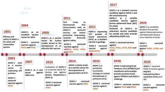 Currently, live vaccines based on lentogenic AOaV-1 strains Hitchner B1, LaSota, Fuller (F), and mesogenic strain R2B are commonly utilised. AOaV-1 strain F is a low-virulence virus that has been investigated in different countries throughout Europe, Africa, and Asia in the form of a live vaccine []. AOaV-1 research is not only focused on its pathobiology, but also on its potential use as a vaccine vector to develop novel vaccines for poultry and mammals, including humans [,,]. Numerous AOaV-1-vectored vaccines expressing protective antigens from various pathogens have been developed since the first recombinant AOaV-1 expressing a foreign gene in 2000 (Figure 1) []. In addition, AOaV-1 encodes six major proteins, resulting in less immune response competition between vector proteins and the expressed foreign antigen. The AOaV-1 replicates in the cytoplasm do not integrate into the host cellular DNA, and do not cause persistent infection. In addition, the AOaV-1-vectored vaccine can also be used as a “differentiating infected from vaccinated animals” (DIVA) vaccine. Therefore, the aim of this review is to summarise the recent advances in the field of the AOaV-1 vectored vaccine and discuss its potential application against emerging and re-emerging animal and human viral pathogens.