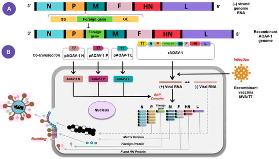 The transfection of cultured cells with plasmids encoding the viral components of functional nucleocapsid, full-length antigenomic RNA, major proteins involved in viral replication and transcription (N, P and L) under the control of bacteriophage T7 RNA polymerase promoter, allows infectious AOaV-1 to be recovered entirely from cloned cDNA, which is also known as reverse genetic technique (Figure 3) [,,,,,]. A foreign gene flanked by AOaV-1 GS and GE sequences was inserted within a non-coding region of the AOaV-1 genome. Foreign genes are more efficiently expressed when they are inserted closer to the 3′ end of the genome due to polar gradient transcription. While it is possible to insert a foreign gene between any two AOaV-1 genes, i.e., the insertion site between the P and M genes has proved ideal for efficient expression of the extraneous proteins [,,,]. The AOaV-1 adapts the external genes with good stability and can express up to three foreign genes within a single AOaV-1 vector [].