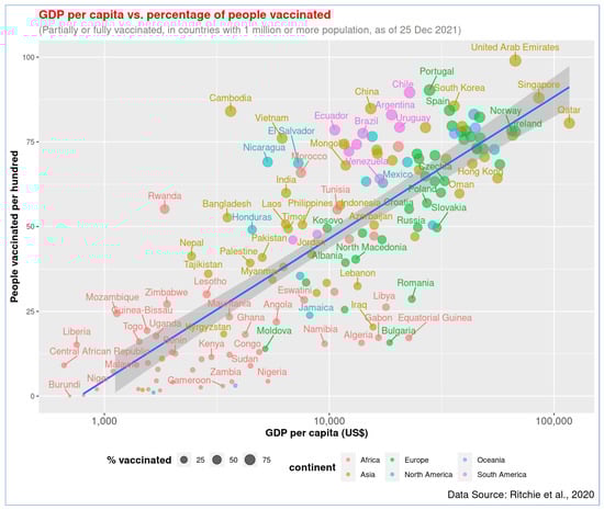 Figure 1 shows a strong linear association between GDP per capita and the proportion of the people vaccinated (partially or fully) in 153 countries of the world (r = 0.79, p < 0.001), where data for both vaccination rates and GDP were available. GDP per capita (log10) explains about 63% variation in the vaccination rate across the countries. In general, the wealthier the nation is, the higher the vaccination rate. The top three countries with the highest vaccination rate are the United Arab Emirates (UAE), Portugal, and Chile. GDP per capita of these top-performing countries is more than US$22,000, and their vaccination rate is above 89%. In contrast, the bottom three countries are Burundi, the Democratic Republic of Congo (DRC), and Haiti. The GDP of these countries is less than US$1700, and their vaccination rate is 1% or less.