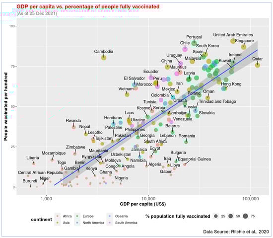 Key drivers of economic growth such as education and health, which may affect vaccine acceptance, were not considered in this analysis. Additionally, vaccine import and export control cooperation and conflicts between countries that may have an impact on COVID-19 vaccination acceptance were not considered due to the limitations of the dataset used in this study. However, this current study aimed to establish the association between nations’ GDP with COVID-19 vaccination rates. It has been revealed with COVID-19 vaccination progress that humanity is divided into “haves” and “have-nots”. Developed countries are securing their populations with vaccination, unlike the developing countries. The important takeaway message is that the COVID-19 vaccine rollout is uneven and that countries in the Global South are not performing as well as those in the Global North. Therefore, there are large country-level disparities in being able to achieve herd immunity, and efforts toward attaining global herd immunity are severely hampered. One of the biggest challenges that may be observed in the equitable global distribution of COVID-19 vaccines is that there is a disconnect between how some countries agree to do things to show global unity among leaders and the real implementation of the agreement.