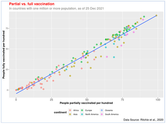 Similarly, a statistically significant correlation was also observed between GDP per capita (log10) and full vaccination rate, r = 0.82, p < 0.001, there is a linear association between these two variables (Figure 2). Countries like UAE, Portugal, and Singapore have already provided full vaccination to over 87% of people, while Burundi, DRC, and Chad barely immunized people with two doses (less than 0.5%). The data on partial and full vaccination rates are highly correlated, r = 0.98, p < 0.001 (Figure 3). The countries with higher partial vaccination also achieved higher full vaccination rates (detailed information of all countries are provided in Supplementary Table S1).