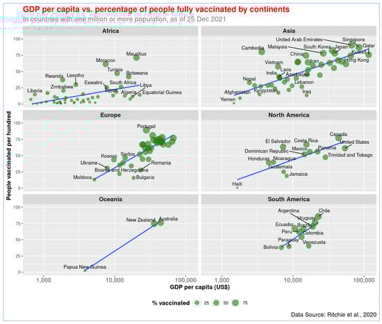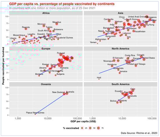 The global pattern of the association between GDP per capita and vaccination holds across continents (Figure 4 and Figure 5). The richer the country, the higher the vaccination rate is in every continent. The wealthy countries in Europe, North America, and Asia managed to protect a higher proportion of the population with the vaccine. As shown in Figure 4 and Figure 5, African countries have the lowest income. Except for a few, such as Mauritius and Morocco, all other countries in that continent are lagging in COVID-19 vaccination.