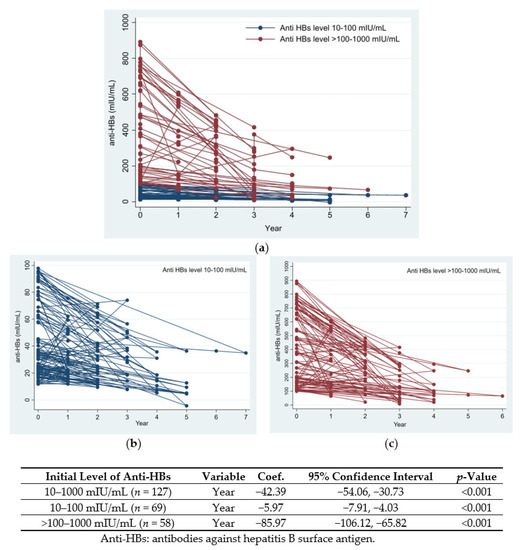 One hundred and twenty-seven participants with initial anti-HBs levels of 10–1000 mIU/mL and at least one additional follow-up result met the analysis criteria. Mixed-model regression analysis was used to determine the change in the rate of anti-HBs. Overall, anti-HBs levels decreased at a rate of −42.39 mIU/mL per year (95% CI, −54.06 to −30.73 mIU/mL; p < 0.001).