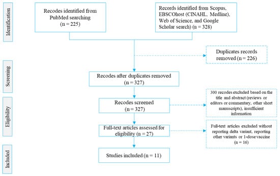 We conducted a comprehensive search for academic research studies that reported the effectiveness of COVID-19 vaccines against the COVID-19 Delta variant, published between 1 May 2021 and 30 September 2021, from the following electronic bibliographic databases: Scopus, EBSCOhost (CINAHL, Medline), PubMed, Web of Science, and the first 20 pages of Google Scholar. The following search terms were used with no language restrictions: