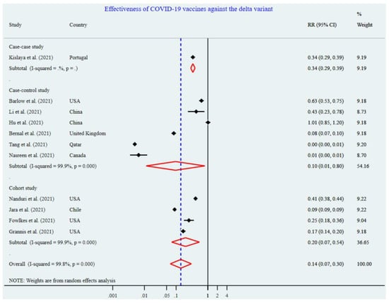Given the high heterogeneity between studies (I2 > 50%) [], we used random effects meta-analysis models to obtain pooled two-dose COVID-19 vaccines effectiveness (VE) estimates against the Delta variant (B.1.617.2), complemented with a sensitivity analysis to examine the effects of outliers. VE was calculated as 1—risk ratio (RR).