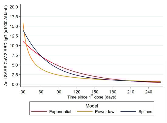 Comparison of three models (splines, exponential, and power-law) for the predicted trajectories of anti-SARS-CoV-2 RBD IgG antibody levels over time.