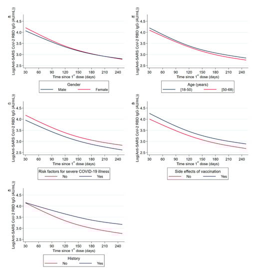 Waning, based on mixed model, of anti-SARS-CoV-2 RBD IgG antibody levels over time from the first dose by (a) gender, (b) age, (c) risk factors for severe COVID-19 illness, (d) side effects of vaccination, and (e) history of COVID-19 infection in pre-vaccination period.