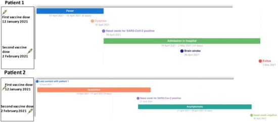 The analysis of the SARS-CoV-2 RNA isolated from the nasopharyngeal swabs of both cases showed the presence of the same viral clade, the VUI202012/01 GRY (B.1.1.7) viral variant, named the Alpha variant. In Case 1, the threshold cycle (CT) of the RT-PCR was 21 for ORF 1ab, N and E genes. In Case 2, the CT was 28 for ORF 1ab, N and E genes. Furthermore, the neighbor joining and maximum likelihood methods were performed to evaluate the similarity and evolution analysis (Supplementary Figure S1).