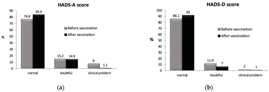 Figure 1b shows similar results on the depression scale, but in this case the percentage of patients with results compatible with a clinical problem was very low, both before and after vaccination. Regarding the depression score, a slight decrease occurred in the doubtful scoring band after vaccination, while the percentage of patients with results considered within the normal range increased.
