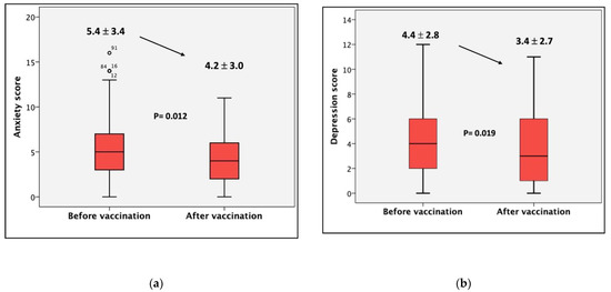 Comparative results of scores before and after vaccination (for all participants). The patients presented a significant improvement in both anxiety (p = 0.012) and depression (p = 0.019) scores two weeks post-vaccination. (a) The left panel shows anxiety score before vaccination and two weeks after the second dose of vaccination. Before vaccination: mean ± standard deviation: 5.4 ± 3.4, median: 5 (IQR: 3–7). After vaccination: mean standard deviation: 4.2 ± 3.0, median: 4 (IQR: 2–6). p = 0.012 Mann−Whitney U test. (b) The right panel shows the depression score before vaccination and two weeks after the second dose of vaccination. Before vaccination: mean ± standard deviation: 4.4 ± 2.8, median: 4 (IQR: 2–6). After vaccination: mean ± standard deviation: 3.4 ± 2.7, median: 3 (IQR: 1–5). p = 0.019 Mann−Whitney U test. Before vaccination, n = 117. After vaccination, n = 87.
