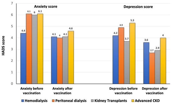 The objective of our study was to analyze the impact of vaccination against SARS-CoV-2 on anxiety and depression scores in patients with different modalities of chronic kidney disease.