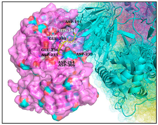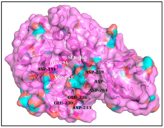 The proposed dockable surface groove for FLCSSpike in Furin, proximal to its catalytic triad. To demarcate the proposed binding pocket, a semi-opaque surface representation (colored according to atom types) is chosen over and above a backbone cartoon. The catalytic triad (D153, H194, S368) is presented as ‘balls and sticks’ and are labeled in ‘white’ over and above the cartoon display. Among all exposed and partially exposed anionic residues (see Table S3, Supplementary Materials), the ones that are in close vicinity to the dockable groove surface are also shown in ‘balls and sticks’ and are further labeled in ‘black’. These residues are amenable to form interfacial salt-bridges with the FLCSSpike–arginines (in 681PRRAR685) and collectively add to the potential of forming dynamically interchangeable ionic bond networks at the Spike–Furin interface.