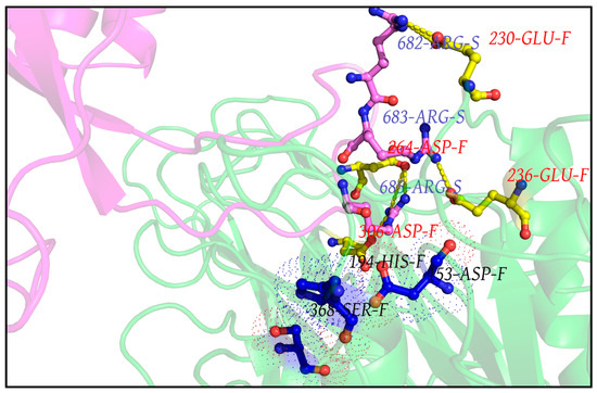 The high persistence interfacial salt-bridges formed between FLCSSpike and the triad-proximal Furin anionic residues (in RR1CoV-2). The figure highlights the highest persistence Spike–Furin interfacial salt-bridges (thick yellow dashed lines) for the three arginines in the 681PRRAR685 (FLCSSpike) along its 300 ns MD simulation trajectory (produced from RR1CoV-2). Only a close up view of the interface is portrayed to highlight the key (highly persistent) salt-bridges (pers > 0.85) sustaining the interface. Only the Furin proximal part (FLCSSpike with short flanking regions at either end) of the Spike (chain S) is shown in magenta cartoon (with R682, R683, R685 highlighted in ‘balls and sticks’), while the Furin chain (chain F) is drawn in green cartoon with its counter-ionic residues involved in the (aforementioned) key Spike–Furin interfacial salt-bridges highlighted in ‘balls and sticks’. Residues comprising the catalytic triad are presented in ‘balls and sticks’ colored in navy blue and highlighted by dot surface points. Figures were built in PyMol. Residues are differentially labeled with font colors blue (681PRRAR685 arginines), red (Furin anionic residues) and black (catalytic triad).