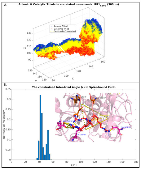 The first noticeable observation in the dynamic ensemble (pertaining to RR1CoV-2) was that the three arginines (R682, R683, R685) in the 681PRRAR685 almost always remain engaged in dynamically interchangeable ionic bonds formed with anionic side chains coming from the host Furin. These amenable anionic side chains (D191, E230, D233, E236, D259, D264, D306, see Table S4) are indeed physically proximal to the catalytic triad (Figure 3), nicely fitting in the FLCSSpike into the proposed dockable surface groove. While most (if not all) of them fall into the non-rigid ‘expected’ set (Table S3), they should collectively present some correlated movements with FLCSSpike in order to remain conformationally viable for dynamically stable ionic bond networks. Further, as reflected from the distribution of salt-bridge persistence (see Table 1), the three arginines in 681PRRAR685 were often involved in multiple and interchangeable ionic bonds. In other words, the same arginine (target) in 681PRRAR685 can simultaneously be in contact (at a given instance) with more than one negatively charged residue coming from the host Furin (neighbor). This will lead to the formation of non-disjoint sets of target-neighbor ionic bond pairs (or, salt-bridges) for the same target. In other words, sets of salt-bridges containing distinct anionic partners for a given target arginine (681PRRAR685) would, thus, be non-disjoint. This implies that the persistence values of the arginine salt-bridges (in 681PRRAR685) may add up to more than unity (see Table 1). In fact, dynamic interchangeability of counter-ions are common characteristic features of salt-bridges formed at disordered protein regions and/or [53,54] disorder–globular interfaces [90,114], wherein the formed ion pairs keep changing their counter-ionic partners [53]. Such collective dynamics results in salt-bridges of varying persistence and multiplicity across the trajectory, including persistent, as well as transient, salt-bridges [53,54,113,115]. Transient and/or unfavorable salt-bridges have been revealed to be functionally optimized in proteins [53,116] and are often found on enzyme surfaces [116] as well as on strategic locations spread around extended disordered protein regions [53]. For the latter case, one of the evolved key mechanisms towards achieving this functional optimization is to make their charged side chains often amenable to proximally approached ordered protein interactors. The transient nature facilitates the exchange of their counter-ionic partners, thereby triggering the switch from intra- to inter-molecular (interfacial) salt-bridges. The multiplicity (or promiscuity [53]) in the choice of the counter-ionic partner in a salt-bridge can further be chemically and electrochemically rationalized from the bifurcated nature of side chain groups with degenerate charge centers in four out of the five charged amino acids (guanidium+: Arg; carboxylate-: Asp, Glu; imidazol+: His+) in proteins. However, in spite of this observed multiplicity, each of the three arginines in 681PRRAR685 seemed to have their own preference for particular anionic partners: E230 for R682 (pers: 0.93), E236 for R683 (pers: 0.85) and D306 for R685 (pers: 0.90) (see Figure 4). These three key anionic residues involved in the highest persistent arginine salt-bridges (in 681PRRAR685) were further envisaged to form a combined molecular entity (let us call it the ‘anionic triad’) made up of discrete molecular components (anionic side chains). The anionic triad and the catalytic triad (D153, H194, S368) remained proximal and approachable (average centroid–to–centroid distance between side chain atoms: 13.16 Å, SD: 0.72) throughout the 300 ns trajectory (RR1CoV-2) with the display of correlated movements, similar to an ordered pair (Figure 5A). To analytically confirm the visually apparent correlated movement, the inter-triad angle (ε), defined as the planer internal angle subtended by the two position vectors originated from the Furin molecular centroid that connect the centroids of the two triads (Figure 5B), was surveyed across the trajectory. The inter-triad angle was found to be strictly constrained (<ε> = 45.1°, SD = 4.7) having an apparently bi-modal distribution with two modes at ~42.1° and ~52.8°. Together, these results effectively portray ‘correlated movements’ of the two triads (catalytic and anionic) which further indicate the dynamically sustained mutual preference of the FLCSSpike and its dockable surface groove on Furin, and that their binding and subsequent cleavage occurs in close vicinity and supervision of the catalytic triad. This, in turn, effectively supports the salt-bridge hypothesis.