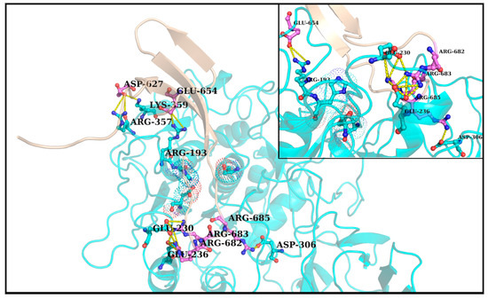Densely connected composite ionic bond motifs in the persistent salt-bridges formed at the Spike–Furin interface (RR1CoV-2). The figure plots a representative snapshot of the interface (with a close-up view for the ionic bond motifs in its inset) randomly picked from the trajectory of RR1CoV-2. The same from ZR1CoV-2 is portrayed in Supplementary Figure S5.