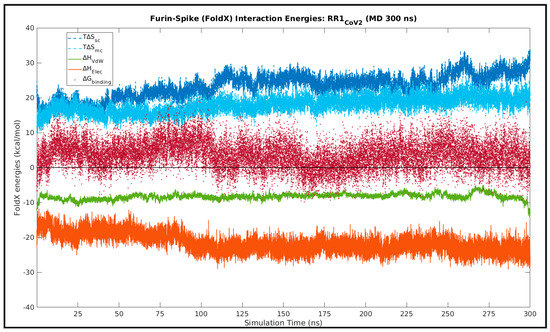As a mean to probe a highly likely event of ‘enthalpy entropy compensation’ associated implicitly with the the Spike–Furin interaction, structure-based equilibrium thermodynamic parameters (∆H, ∆S, ∆G) were calculated for the selected representative structure (RR1CoV-2) along its entire MD simulation trajectory (300 ns) using the standalone (C++ with boost library) version (v.4) of FoldX (http://foldxsuite.crg.eu/, (accessed on 15 November 2021)) [93,94]. FoldX has its energy terms carefully parameterized by actual experimental data from protein engineering studies [93], which, together with its high computational speed, are definite edges over the traditional MM(PB/GB)SA approaches [95]. It is for these reasons that FoldX is slowly but surely taking over traditional approaches in structure-based thermodynamic calculations, particularly in the domain of protein engineering and stability analysis [96,97]. FoldX is built on a ‘fragment-based strategy’ that exploits the power of fragment libraries [98] in the same direction to that of the most compelling ‘fragment assembly simulated annealing’ approach in protein structure prediction attributed to David Baker and Rosetta [68]. Along with net free-energy changes (ΔGbinding/folding) the advanced empirical force field of FoldX also returns a plethora of different favorable or disfavored transition enthalpic as well as entropic energy terms for proteins (folding) and PPI complexes (binding) directly from their high-resolution 3D coordinates (using full atomic description). To address the plausible ‘enthalpy entropy compensation’ in the current context, as enthalpic terms we included the favorable van der Waals (∆HvdwF) and electrostatic (∆Helectro, ∆Helec-kn) contributions to free energy, as well as the disfavored van der Waals clashes (∆Hvdw-clash, ∆Hvdw-clash-backbone); while, to account for the entropic costs, we included the entropic energies for backbone (T∆Smc) and side chain (T∆Ssc) conformational changes. The choice of the terms was guided by well-just reviews and discerning follow-up studies on FoldX [96,99]. The enthalpic terms were further summed up according to the nature of forces giving rise to each.