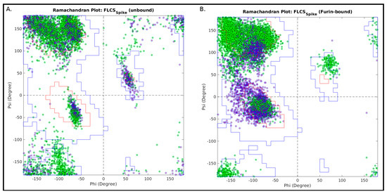 The loop-disorder is further supported by extensive (coarse-grained) multi-microsecond molecular dynamic (MD) simulations of the representative SARS-CoV-2 Spike structures (6VXX, closed state; 6VYB: partially open state, ectodomain) [40] with modeled FLCSSpike loops (residue ranges: 676–690) [48] that show violation of ergodic hypothesis [40], hinting towards a flexible, albeit biased, conformation of the activation loop for its function. In other words, during the entire course of these long MD simulations, the loops remained largely unstructured [40], sampling several outwardly extended conformations making them attractive and accessible cleavage sites for Furin and other pro-protein convertases. Thus, the loop disorder does not appear to be short-termed, but rather dynamically sustained in the free form of the Spike. As an alternative and arguably a complementary approach, the same paper further models an ensemble of loops ab initio [40] via RosettaRemodel [49] from the closed state Spike structure (6VXX). Subsequent to the modeling, followed by clustering and sorting based on energy, the lowest energy conformation was retained and further refined by kinetic closure [50]. In the conclusive remarks [40], the authors comment that the ab initio modeling indicated that there might be formation of short helices near the cleavage site of the loop; however, these observations are not really supported by any data and/or geometric analysis, such as the Ramachandran plot. The very fact that the FLCSSpike (in its 681PRRAR685) contains pockets of heavily localized positive charge clouds (a common cause of protein disorder [51]) makes it naturally and intrinsically prone to structural disorder. This makes the analysis even more interesting and non-trivial, and further implies that there needs to be a ‘disorder-to-order transition’ [51] of the said loop (i.e., the FLCSSpike region) upon interaction (or binding) with Furin. That is because the binding needs to be strong enough to sustain the disordered substrate (FLCSSpike) jammed into metastable intermediate conformation(s) that support the efficient cleavage of the Spike–S1/S2 junction by the Furin catalytic triad. Recent experimental studies primarily based on functional assays have referred to the ‘ostensibly unresolved’ FLCSSpike as a ‘protruding out loop-like structure’ in the exterior [35] of the SARS-CoV-2 Spike, away from the RBDSpike. Others [52] have completely neglected the plausible conformational variation (entropy) of the missing patch(es) in their molecular docking and dynamics studies. Thus, little has been genuinely explored structurally on the Spike–Furin interaction. Given this background, here, in this paper, we present a rigorous structural dynamics study with strong theoretical rationales to penetrate deeper into the Spike–Furin interaction in SARS-CoV-2 in an atomistic detail. To the best of our knowledge, we are the first group to report on the key ‘disorder-to-order transition’ occurring at the SARS-CoV-2 Spike–Furin interface. Based on present knowledge and understanding, the revealed transition, together with the disorder, intrinsic to the CoV-2 FLCSSpike [24], should find its place at the very heart of the coronavirus molecular pathology. We further demonstrate that the involved ‘disorder-to-order transition’ in CoV-2 is triggered and sustained by highly persistent interchangeable salt-bridge dynamics, which is often characteristic to protein disorder transitions [53,54]. We also present a novel application of the legendary Ramachandran plot [55] in probing the said ‘transition’ at the CoV-2 Spike–Furin interface. The conclusions should also hold true for lately evolving CoV-2 variants [30,32].