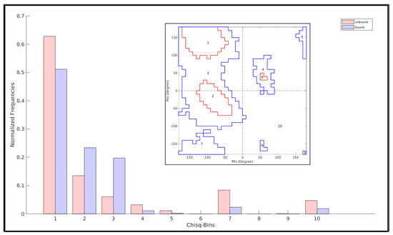 An χ2 test (wherever applicable) was conducted to discriminate between two frequency distributions (say, that of an unbound and a bound state of a protein region spanning different contoured regions the RP) with the χ2-statistic being computed (for an N-bin model; df (degree of freedom) = N − 1) by the following equation.