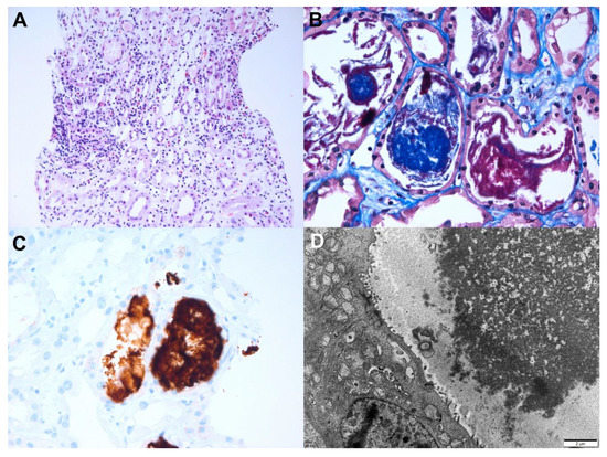 Figure 5. Pathologic findings of acute tubulointerstitial nephritis (patient 2). Light microscopy: (A) Mixed inflammatory cells infiltrated the tubular epithelium (tubulitis) and interstitium. Large numbers of mononuclear cells, neutrophils, eosinophils, and plasma cells were present (hematoxylin and eosin, ×400). (B) Acute tubular injury with red granular casts and string-like appearing casts was observed(Masson’s trichrome, ×400). (C) The casts show strong myoglobin positivity in the immunohistochemical stain (myoglobin, ×400). Electron microscopy: (D) The tubular casts have electron dense granules (×8000, 80 kv).