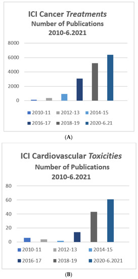 Recent years have brought major advancements in the use of immune therapy and specifically immune checkpoint inhibitors (ICIs) in cancer patients, with expanding indications for various malignancies resulting in the treatment of a large and increasing number of patients [1]. Malignant cancer cells are able to suppress the immune system to evade detection and destruction, in part due to the activation of inhibitor checkpoint pathways. ICIs are monoclonal antibodies that block this ability of cancer cells and permit an immune response against the tumor cells. The Food and Drug Administration approval for ICI therapy was first granted in 2011 and, to date, more than 50 indications have been approved. Importantly, this therapy is now being utilized earlier in the disease course of a variety of tumors. While this therapy significantly improves outcomes in a variety of hematologic and solid tumors, the use of ICI is associated with a substantial risk of immune-related adverse events (irAEs). Cardiovascular toxicity and, in particular, myocarditis, while not the most common side effect of ICIs, is associated with significant morbidity and mortality. The expanding clinical importance of this therapy is reflected in the growing number of publications in the medical literature relating to both ICI treatment and its important cardiovascular toxicities (Figure 1A,B). However, there is limited prospective data available to guide clinical decision-making with regard to the diagnosis and treatment of ICI-related cardiovascular toxicity.