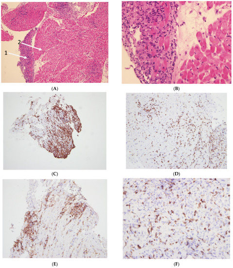 - Mirabel, M.; Callon, D.; Bruneval, P.; Lebreil, A.-L.; Mousseaux, E.; Oudard, S.; Hulot, J.-S.; Andreoletti, L. Late-Onset Giant Cell Myocarditis Due to Enterovirus During Treatment with Immune Checkpoint Inhibitors. JACC Cardio Oncol. 2020, 2, 511–514. [Google Scholar] [CrossRef]