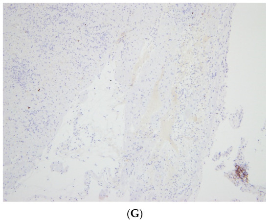 (A) Arrow 1—Dense infiltrate of inflammatory cells, mainly lymphocytes and neutrophils, with evidence of necrosis (on the left). Arrow 2—A region with edema but many more normal nuclei and without an infiltration of lymphocytes and neutrophils. (B) Enlarged image of Figure 1: Left: Significant infiltration of inflammatory cells with necrosis and loss of normal myocardial tissue. Right: Near normal tissue with mild edema. (C) CD163 staining for macrophages with a very intense and large area positive for macrophages. (D) CD3 staining of lymphocytes. (E) CD4 staining representing a subpopulation of lymphocytes. (F) Staining for CD8 representing another subpopulation of lymphocytes. (G) Cells with CD20 staining demonstrating the near complete absence of B cells.