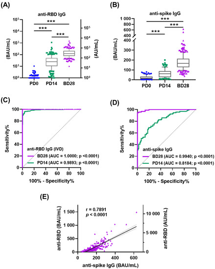 Antibody responses in ChAdOx1 nCoV-19 vaccinated recipients without previous COVID-19. Participant serum samples were collected at PD0, PD14, and BD28. PD0: day 0 before the prime vaccination; PD14: 14 days after the prime vaccination; BD28: 28 days after the boost vaccination. (A,B) Anti-spike RBD (C) and anti-spike (D) IgG levels were measured before and after vaccination. AU: arbitrary units; BAU: binding antibody units. (C,D) Receiver operating curves (ROC) for anti-RBD (A) and anti-spike (B) IgG were analyzed to assess the predicted seropositivity after vaccination. (E) Linear regression analysis was performed to show the correlation of anti-spike RBD and anti-spike IgG. *** p < 0.001.
