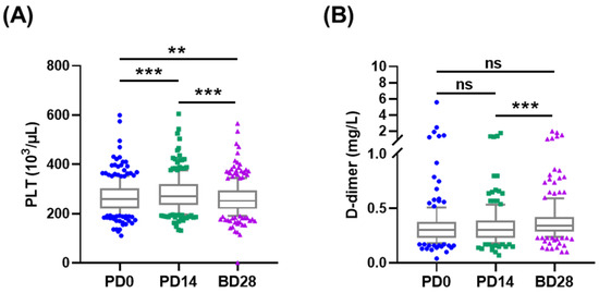 Platelet counts and D-dimer responses induced by vaccination. (A) Platelet counts and (B) D-dimer levels were tested at PD0, PD14, and BD28. ** p < 0.01; *** p < 0.001.
